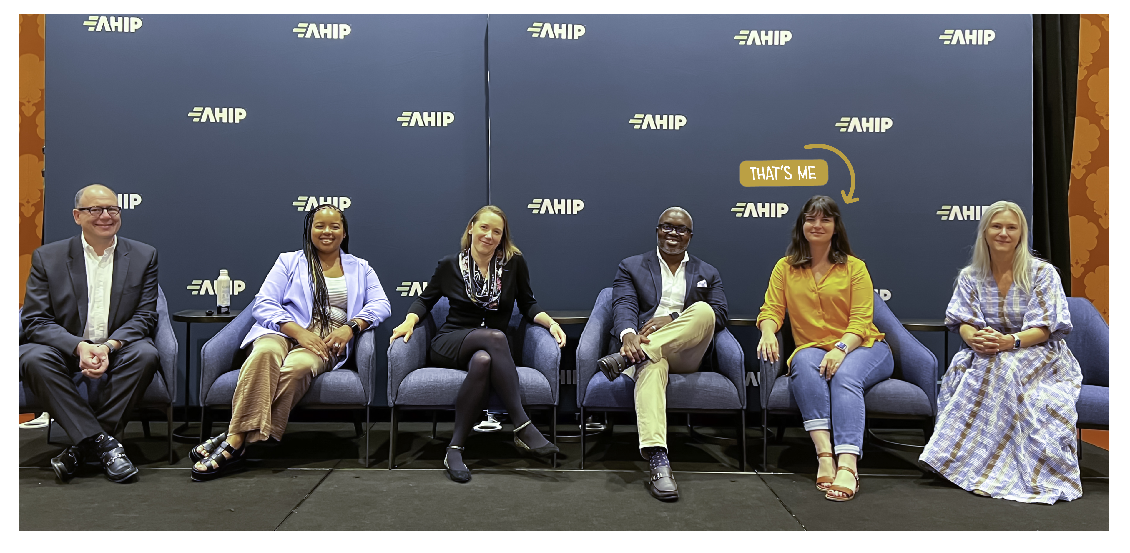Panelists at AHIP 2024: Dr. Cantor (Moderator), Brittany Melhado (Florida Blue first time mom, Consultant), Anne Wanlund (Canopie Founder), Moses Adedoyin (Sr Director of Innovation at GuideWell), Me (Lead Strategist, Innovation Project Lead), Jennifer Jordan (VP, Mom & Baby Division at Aeroflow).