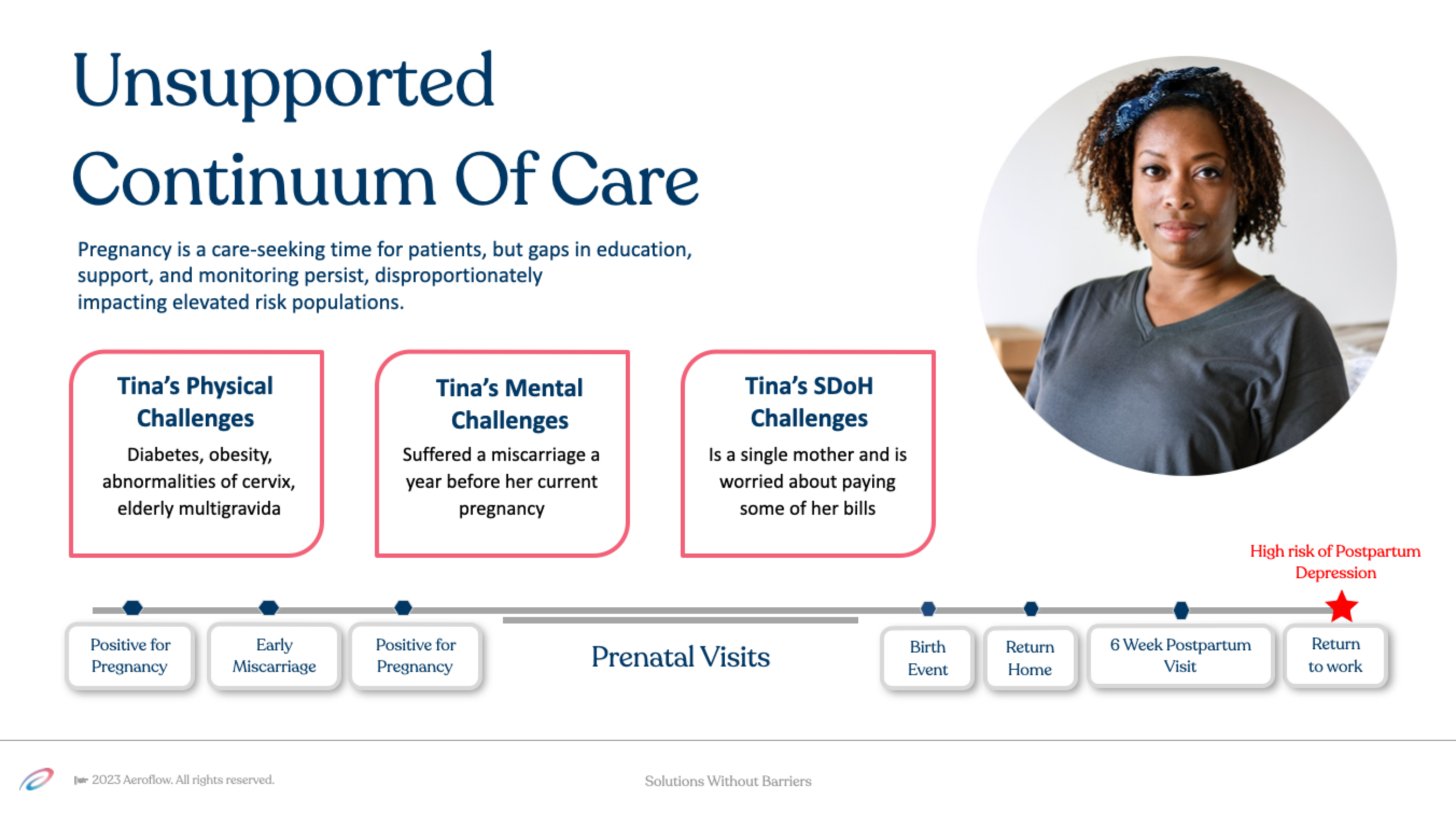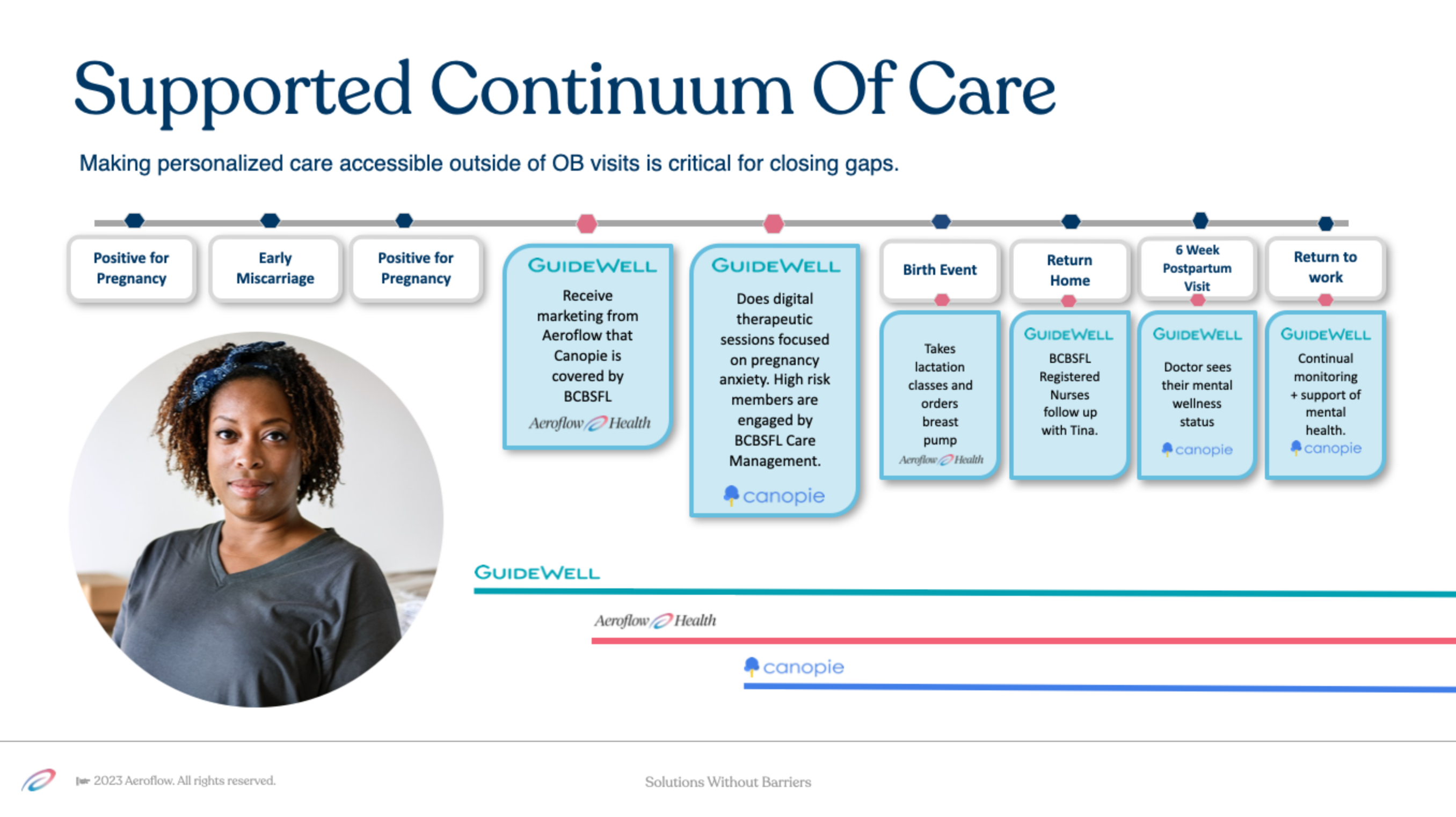 These are some slides from our presentation panel at AHIP 2024. Figure 1 shows our persona Tina's current pregnancy journey, Figure 2 shows how Project Bluebird fits into her pregnancy journey.