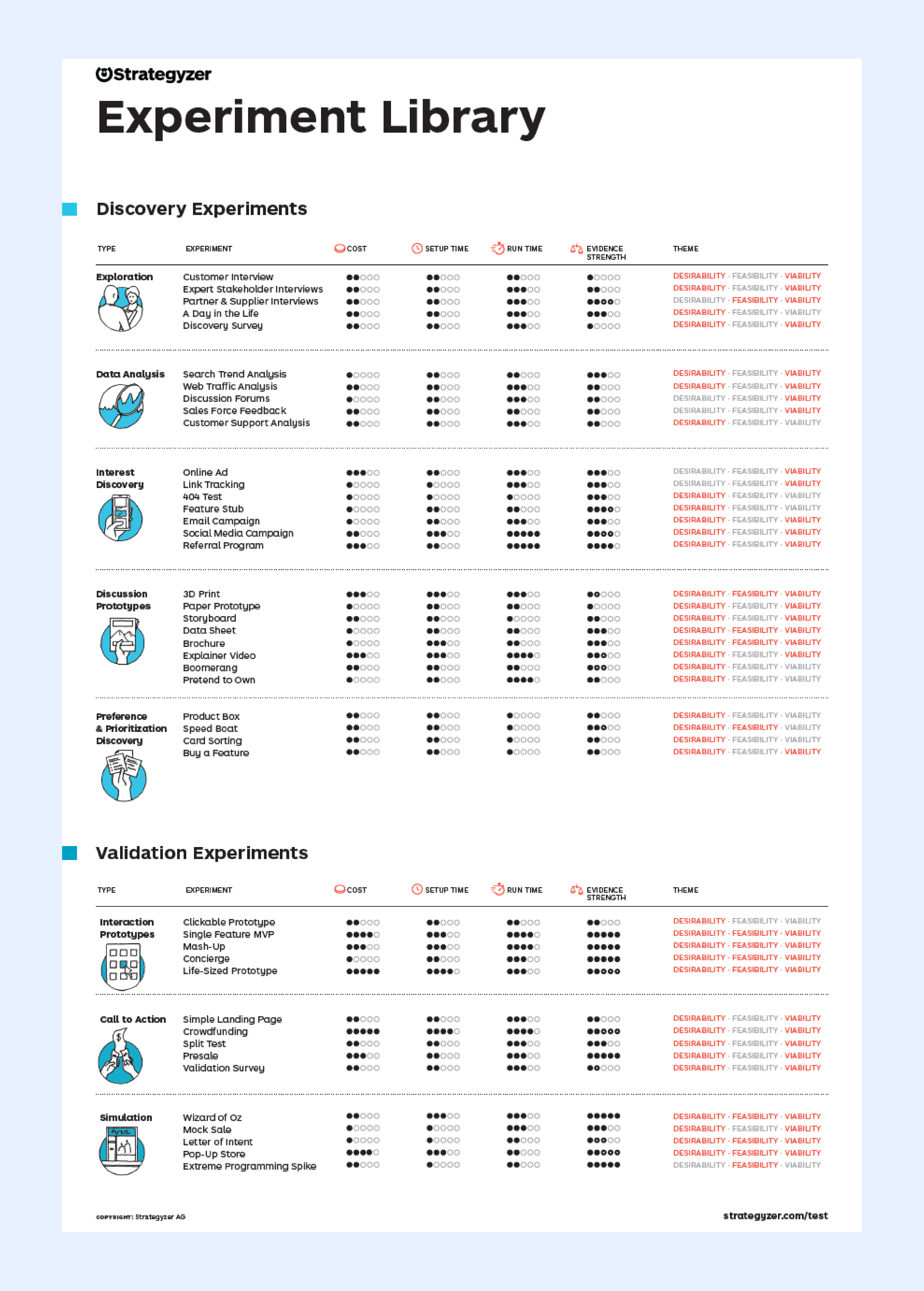 Library of tests / experiments to de-risk assumptions